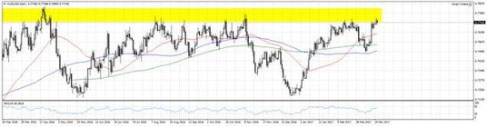 W tym kierunku oddziaływał również spadek notowań rud żelaza, co skutkuje tym, że o poranku AUD jest najsłabszy spośród głównych walut. W nocy również australijski urząd statystyczny opublikował dane na temat cen nieruchomości w ostatnich trzech miesiącach 2016 roku, których wzrost okazał się zdecydowanie wyższy od oczekiwań rynkowych i wyniósł 4.1% k/k wobec 1.5% k/k w III kw. W tym świetle przecena australijskiej waluty wydaje się dość zaskakująca, bowiem lekarstwem na zbytni wzrost cen mieszkań byłoby zacieśnianie polityki pieniężnej, które oddziaływałoby w kierunku umocnienia AUDa. Za dzisiejszym spadkiem notowań australijskiej waluty mogły zatem dodatkowo oddziaływać kwestie techniczne, bowiem notowania AUDUSD na początku tygodnia znalazły się na najwyższym poziomie od listopada 2016 pozostając jednocześnie w rejonie ważnych oporów, których przełamanie, bez istotnych czynników fundamentalnych może być trudne. Na przestrzeni ostatniego roku notowania kilkukrotnie – nieudanie – próbowały wybić się na wyższe poziomy.