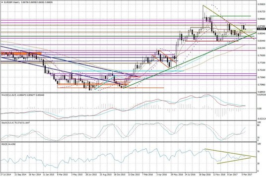 Ciekawy układ w perspektywie kilku tygodni prezentuje się na EUR/GBP. Im mniejsze będą obawy związane z wyborami we Francji, a większe ryzyko przepychanek wokół negocjacji dotyczących Brexitu, tym większe będą szanse na wzrosty EUR/GBP, który zaczyna wyglądać interesująco na tygodniowych wskaźnikach.