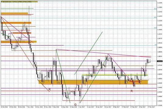 Po zakończonych wyborach parlamentarnych w Holandii, co do których można mieć jednak mieszane odczucia (pytanie, czy słabsze od sondaży wyniki eurosceptyków Wilders'a, oraz lepsze wyniki partii Marka Rutte, nie są wynikiem dyplomatycznej wolty szefa rządu w kontaktach z Turcją na kilka dni przed środowym głosowaniem) uwaga będzie przesuwać się na Francję. Raczej nie powinno się zaniżać ryzyk związanych z wyborami prezydenckimi– nie można być pewnym, że elektorat Marine Le Pen rzeczywiście ma swój szklany sufit. Dużo emocji może przynieść dzisiejsza debata telewizyjna z udziałem 5 głównych pretendentów do urzędu prezydenckiego, która rozpocznie się o godz. 21:00. Kluczowe będzie kilka spraw – na ile przekonywująco wypadnie Emmanuel Macron, tak aby utwierdzić rynki w przekonaniu, że w drugiej turze ma szanse wygrać z Marine Le Pen, a także jak wypadnie sama szefowa Frontu Narodowego. Casus Trumpa pokazuje, że przekaz telewizyjny sprzyja... populistycznym hasłom. Na wykresie EUR/USD układ zapowiadający krótkoterminowe przesilenie – podwójny szczyt wobec oporu z 17 marca przy 1,0781. Widoczna jest bliskość ważnej strefy oporu przy 1,0790-1,0800. Spadki powinny zatrzymać się w rejonie 1,0700-1,0708.