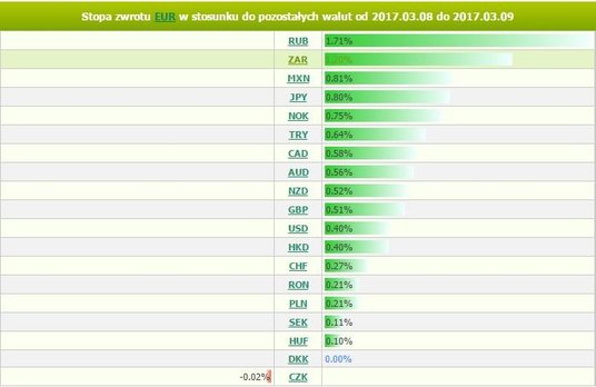 Również konferencja prasowa Mario Draghiego początkowo była dość przewidywalna – powtórzone zostały sformułowania o konieczności utrzymywania luźnej polityki (niskie stopy i program QE), padło też zdanie o możliwości wydłużenia w czasie programu QE poza koniec 2017 r. (oczywiście, jeżeli zajdzie taka potrzeba). Bank zwrócił uwagę na ostatnie odbicie inflacji CPI, ale podkreślił wciąż dość niskie wartości inflacji bazowej. Przyznano jednak, że obserwowane, cykliczne ożywienie gospodarki może nabierać rozpędu w kolejnych miesiącach, chociaż nowe projekcje makro nadmiernie nie zaskoczyły. Na lata 2017-18 projekcje makro podniesiono o 0,1 p.p. względem projekcji z grudnia – odpowiednio do 1,8 proc. i 1,7 proc., ale już na 2019 r. pozostały niezmienione. Z kolei rewizja dla inflacji była zgodna z zaprezentowanymi wczoraj wieczorem przeciekami agencji Bloomberg – 1,7 proc. w tym roku, 1,6 proc. w przyszłym i 1,7 proc. w 2019 r. (tylko ta ostatnia wartość pozostała niezmieniona).