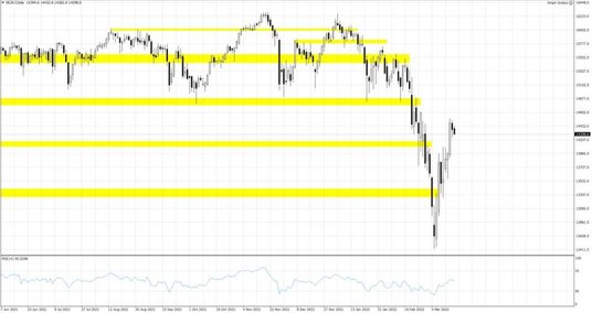 W przypadku niemieckiego Daxa są to okolice 14400 pkt, podczas gdy S&P500 pozostaje blisko 4400 pkt. Odbijają ponownie jednak notowania ropy. Europa ponownie wraca do tematu nałożenia embarga na rosyjskie surowce, a odmiana WTI wraca powyżej 100 dolarów za baryłkę. Na rynku złota bez większych zmian, a notowania pozostają w okolicy 1940 USD za uncję. Wciąż zyskują chińskie spółki. Tym razem po spekulacjach sugerujących, że Ludowy Bank Chin planuje poluzować politykę monetarną. Rynek akcyjny zmierza do zakończenia najlepszego tygodnia od listopada 2020 roku. Długo oczekiwane i wycenione już rozpoczęcie normalizacji polityki monetarnej przez Fed, znajduje się w cieniu innych wydarzeń. Kluczowy pozostaje konflikt pomiędzy krajami Zachodu, a Rosją w obszarze gospodarczym. Potencjalne ograniczenie importu surowców może wywołać jeszcze duże implikacje. Choć główne indeksy zmierzają do odrobienia spadków spowodowanych rosyjską inwazją, to za wcześnie jeszcze, aby powiedzieć, że akcje mają otwartą drogę do powrotu na szczyty. Pentagon informuje, że przedłużająca się wojna, przy dostawach sprzętu dla Ukrainy i utrzymujących się sankcjach nałożonych na Rosję, może prowadzić do kolejnych gróźb użycia broni nuklearnej.