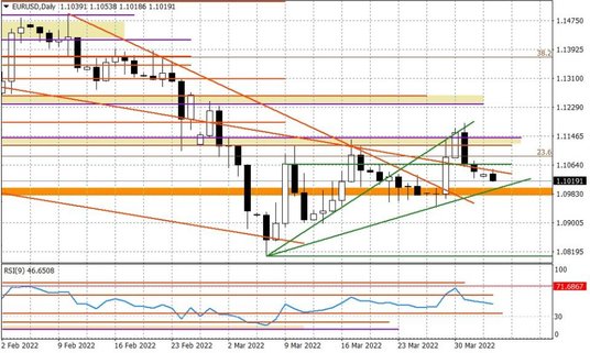 Indeks Sentix obrazujący nastroje wśród europejskich analityków kontynuował w kwietniu silne spadki schodząc do poziomów obserwowanych ostatnio w wakacje 2020 r. To pokazuje, że to jeszcze nie czas na jakieś przesilenie, a perspektywa nałożenia kolejnych sankcji na Rosję, oraz jej odwetu w postaci żądania rozliczeń za eksportowane towary wyłącznie w rublach, tylko będzie podbijać emocje. Dla EURUSD kluczowe będzie jednak to, jak będzie się zachowywał Europejski Bank Centralny w kontekście coraz wyraźniejszej presji inflacyjnej. Agencje cytują Isabel Schnabel (niemiecką członkinię EBC), której zdaniem bank centralny może dokonać podwyżki stóp procentowych dopiero po wygaszeniu skupu aktywów, co jest planowane do jesieni. Tym samym nawet Niemcy nie wzywają do nieszablonowego posunięcia, jakim mogłoby być podniesienie stóp w trakcie trwania QE.