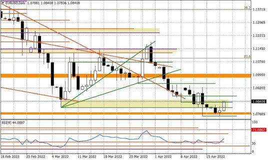 W gronie najsilniejszych walut ponownie znalazł się dolar australijski, który wczoraj został wsparty zapiskami RBA mogącymi sugerować wcześniejszą podwyżkę stóp procentowych. Silne są też NZD, CAD i korony skandynawskie (podobnie jak wczoraj). Ponad poziom 1,08 powrócił EURUSD - inwestorzy zdają się nadmiernie nie obawiać wyborów prezydenckich we Francji, jakie zostały zaplanowane na weekend, oraz niepokojących doniesień z ukraińskiego Donbasu (nie widać projektów radykalnych sankcji wobec Rosji, które całkowicie wyłączałyby import surowców).
