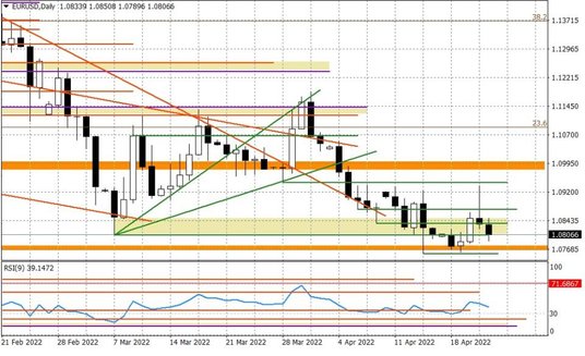 Dzisiaj w gronie najsłabszych walut są Antypody, korygujące wcześniejsze podbicie. Słabo wypada też funt - na GBPUSD doszło do wyraźnego połamania wsparcia przy 1,30 - na co wpływ miały ostrożne sygnały płynące z Banku Anglii w kwestii podwyżek stóp procentowych, oraz słabe dane dotyczące sprzedaży detalicznej na Wyspach za marzec, jakie napłynęły dzisiaj rano (-1,4 proc. m/m). Poniżej ważnego poziomu 1,0870 pozostaje też EURUSD, chociaż wstępne szacunki indeksów PMI za kwiecień wypadają nieźle. To może pomóc w obronie wsparcia przy 1,08, które właśnie jest testowane. Wczoraj do grona tych, których zdaniem ECB powinien dokonać podwyżki stóp procentowych już w lipcu dołączył szef niemieckiego Bundesbanku. Niemniej na razie rynek ma problemy z właściwą wyceną tego "jastrzębiego" scenariusza. Nie pomaga w tym nastawienie szefowej ECB, Christine Lagarde. Jedyną walutą, która wygrywa dzisiaj z dolarem w przestrzeni G-10 jest jen, co może nieco zaskakiwać biorąc pod uwagę sytuację na amerykańskich rentownościach. Siła jena to efekt plotek, jakie pojawiły się po rozmowie japońskiego ministra finansów z szefową Departamentu Skarbu USA. Chodzi o wspólną interwencję, która miałaby przerwać trend na słabego jena wobec dolara. Japońscy oficjele odmówili komentarza, czy takowy wątek został w ogóle poruszony. Technicznie trend na USDJPY zaczyna jednak słabnąć i testowany jest rejon 128,00.
