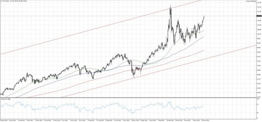 Notowania ropy dobijają do najwyższych poziomów od początku marca, a baryłka WTI wyceniana jest w okolicy 119 USD. Pozytywnie na notowania czarngo złota oddziałują również wczorajsze informacje o odradzającym się popycie z Chin. Niemiecki Dax spada poniżej 14500 pkt., a notowania kontraktu terminowego na S&P 500 osuwają się w kierunku 4100 pkt. Unijne sankcje zakazują zakupów ropy drogą morską, transport rurociągami jest tymczasowo zwolniony z nich, za czym lobbowały Węgry. Nie jest to twarde embargo, ale wystarcza do podniesienia obaw związanych z deficytem surowca na rynku, szczególnie, że Niemcy i Polska sugerowały stopniowe zmniejszanie transportu rurociągami.