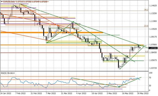 Wczoraj EURUSD nie wykorzystał szansy w postaci wyższej inflacji w strefie euro (HICP w maju sięgnęła 8,1 proc. r/r) i zawrócił w dół po przetestowaniu linii spadkowej trendu rysowanej od szczytu z lutego b.r. Dzisiejsze odczyty PMI dla przemysłu za maj były już niższe od tych z kwietnia, ale nie tak słabe, jak można było się tego obawiać. Niemniej na rynku zaczyna pojawiać się pogląd, że ECB nie zrobi więcej ponad to, co już zapowiedział (najbliższa podwyżka w lipcu o 25 pb), gdyż może obawiać się wyhamowania ożywienia gospodarczego.