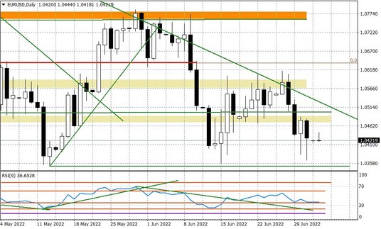 W piątek podaż sprowadziła notowania poniżej czwartkowego dołka przy 1,0380, ale nie zdołała przetestować minimum przy 1,0350. Dołek wypadł przy 1,0365 i później ponownie rynek zawrócił ponad poziom 1,04. Proces szukania dna trwa, zatem nadal. Co dalej? Poniedziałek raczej nie przyniesie konkretnego kierunku - kluczowe będą dane z USA, które poznamy w kolejnych dniach. Bo to dolar będzie w tym tygodniu rozdawał karty w kontekście sentymentu bazującego na oczekiwaniach wobec polityki FED. Teoretycznie wsparciem dla euro mogłyby być spekulacje wokół skali podwyżki stóp na posiedzeniu EBC 21 lipca (ruch o 50 pb), chociaż na razie członkowie tego gremium wypowiadali się głównie na temat ruchu w tej skali we wrześniu.