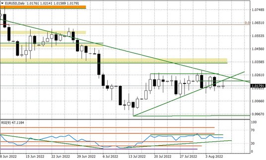 Dzisiaj dolar jednak cofa się na szerokim rynku korygując umocnienie z piątku. Kluczowa publikacja to teraz inflacja CPI, którą poznamy w środę. Rynki mają świadomość, że do posiedzenia FED zostały jeszcze (lub też aż) 44 dni, a takie tempo podwyżek stóp (75 punktów na posiedzenie) jest nie do utrzymania na jesieni. Innymi słowy - piątkowe dane wytrąciły argumenty za kontynuacją obserwowanego od połowy lipca osłabienia dolara, ale i też nie ma mocnych przesłanek za wejściem w silną falę wzrostową.