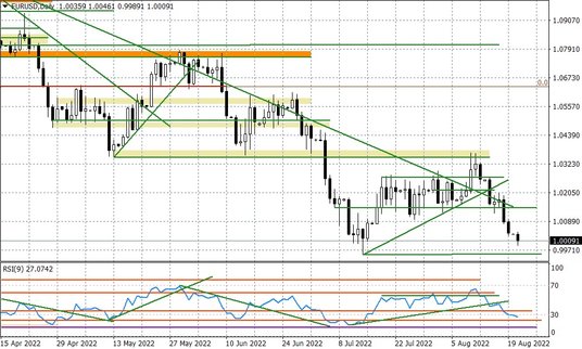 Notowania EURUSD powróciły w okolice parytetu relatywnie szybko - ostatni raz te okolice obserwowaliśmy w połowie lipca. Podwyżka stóp procentowych przez Europejski Bank Centralny o 50 punktów bazowych w końcu lipca niewiele tu pomogła. Tym samym rynek sceptycznie podchodzi do wpływu kolejnego posunięcia, jakie jest możliwe we wrześniu. Słabość euro wynika z obaw o recesję, którą potęgować mogą działania Rosjan na rynku surowców - dzisiaj nerwowość wywołały kolejne doniesienia o trzydniowym wyłączeniu gazociągu Nord Stream I w końcu sierpnia. Rynek może się też obawiać eskalacji konfliktu rosyjsko-ukraińskiego na jesieni i zimą. Słowem, perspektywy dla euro pozostają słabe.