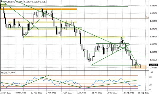Trudno ocenić, na ile członkowie Europejskiego Banku Centralnego przebudzili się po słowach szefa FED, który słusznie zauważył, że nie można dopuścić do sytuacji w której inflacja pozostawałaby na wysokich poziomach bardzo długo, a na ile jest to retoryka przed zaplanowanym na 8 września posiedzeniem EBC, na którym spodziewane są dalsze działania zmierzające w stronę zacieśnienia polityki monetarnej. W zeszłym tygodniu pojawiły się plotki, że decydenci mogliby rozważyć zakończenie reinwestycji środków z wygaszonego już programu skupu aktywów APP, co mogłoby być jakimś substytutem braku wyraźniejszych działań na stopach procentowych. Niestety te same źródła podały, że taka decyzja raczej nie zapadnie na wrześniowym posiedzeniu. Niemniej decydenci w ECB mogą być bardziej aktywni przed tym spotkaniem i to już się dzieje - padły głosy, za tym, aby podwyżka wyniosła nawet 75 punktów bazowych, ale najbardziej przewijało się niezadowolenie ze zbyt niskiego kursu euro. Tyle, że czy ECB byłby zgodny, co do tak "jastrzębiego" konsensusu? Mało prawdopodobne. Rynek zakłada, że stopy procentowe wzrosną o kolejne 50 punktów bazowych, ale to może być niewystarczające do tego, aby odwrócić spadkowy trend na EURUSD.