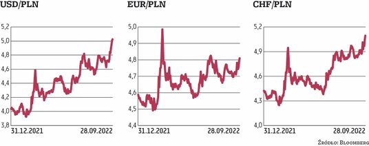 Inwestorzy nadal są negatywnie nastawieni do polskich aktywów, co przekłada się na słabość złotego względem najważniejszych walut. W efekcie kursy dolara i franka znalazły się na nowych szczytach. W środę za dolara trzeba było płacić już nawet 5,06 zł, frank szwajcarski kosztował ponad 5,10 zł, a euro wyceniane było powyżej 4,83 zł.