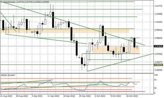 Wczorajsze spadki nie są dzisiaj kontynuowane, choć EURUSD nieco się ociąga z powrotem ponad poziom 0,98. Na rynku mamy przeciąganie liny pomiędzy FED, a ECB. Przedstawiciele Rezerwy pozostają "jastrzębi" w temacie stóp procentowych, ale ich słowa nie wnoszą nic ponad to, co rynek zdaje się już wiedzieć - stopy procentowe raczej nie wzrosną w przyszłym roku ponad poziom 5,0 proc. i począwszy od lutego 2023 r. możliwa jest kilkumiesięczna pauza w cyklu, która pozwoli ocenić "skuteczność" podjętych już ruchów. Z kolei ze strony ECB mamy już "ciszę" przed posiedzeniem zaplanowanym za tydzień, ale rynek raczej powinien nastawić się na "jastrzębie" zaskoczenia w postaci mocnych deklaracji podwyżek także w 2023 r. Ta konfiguracja może pomóc w wypchnięciu notowań EURUSD w stronę parytetu.