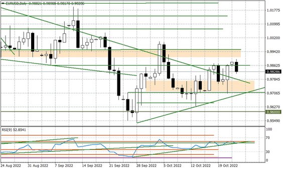 Do tej pory każde testowanie linii spadkowej trendu rysowanej od lutego b.r. kończyło się trwającą kilka dni serią wyraźnych spadków EURUSD. Teraz sytuacja wygląda inaczej, co może być zapowiedzią czekających nas zmian w średnioterminowym układzie eurodolara. Duże znaczenie miał tu piątek, kiedy to spekulacjach dotyczących pivotu FED (słowa Timiraosa z Wall Street Journal) dolar wyraźnie zawrócił na szerokim rynku, co w przypadku EURUSD doprowadziło do powrotu w okolice 0,9860.