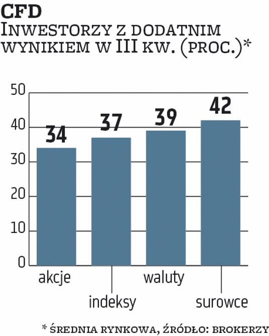 Lepiej inwestorzy radzili w przypadku instrumentów surowcowych. Odsetek tych, którzy zyskali w III kwartale, wyniósł nieco ponad 42 proc. i był porównywalny z wynikiem II kwartału. W tej kategorii błysnęli klienci BM Alior Banku. Prawie 55 proc. z nich zakończyło kwartał na plusie. Najsłabiej znów wypadli klienci XTB. Tutaj odsetek osób z dodatnim wynikiem wyniósł nieco ponad 36 proc.