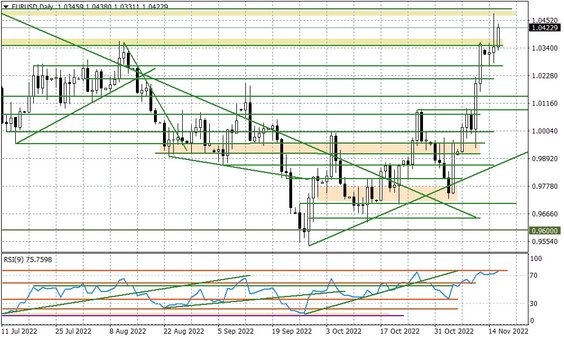 Wczoraj po południu notowania EURUSD ustanowiły maksimum przy 1,0479 po publikacji niższej inflacji PPI z USA, ale później ruch ten został wymazany (rynek szybko wrócił się w stronę 1,04). Informacje o rosyjskich rakietach doprowadziły do pogłębienia zniżki i zejścia do 1,0280, po czym ponownego zawrócenia w górę po tym jak pojawiło się więcej informacji na temat tego incydentu. Dzisiaj rano EURUSD ponownie wybił się ponad 1,04, a wsparciem mogły być słowa wiceprezesa ECB (de Guindos), który dał do zrozumienia, że walka z wysoką inflacją powinna być priorytetem dla banku centralnego (dla rynków to argument za tym, że ECB może podnosić stopy także przez większą część 2023 r., podczas, gdy rynek wycenia zatrzymanie cyklu przez FED w I kwartale).