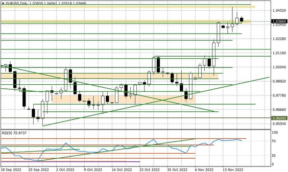Ostateczna inflacja HICP za październik dla strefy euro wypadła nieco poniżej oczekiwań - to wartości 10,6 proc. r/r i 5,0 proc. r/r dla bazowej, które są i tak wyższe, niż we wrześniu. Niemniej agencja Bloomberg donosi powołując się na swoje źródła, że w ECB konsensus dla grudniowej podwyżki stóp procentowych to bardziej 50 punktów baz., niż kolejna agresywna podwyżka o 75 punktów baz. Nie powinno być to zaskoczenie, biorąc pod uwagę podziały w ECB, oraz widoczną tendencję także w innych bankach centralnych, aby podwyższać stopy procentowe metodą mniejszych kroków na posiedzenie. Niemniej dla EURUSD może być to jakiś pretekst do korekty, zwłaszcza, że dolar zaczyna się odbudowywać na szerokim rynku po ostatniej przecenie.