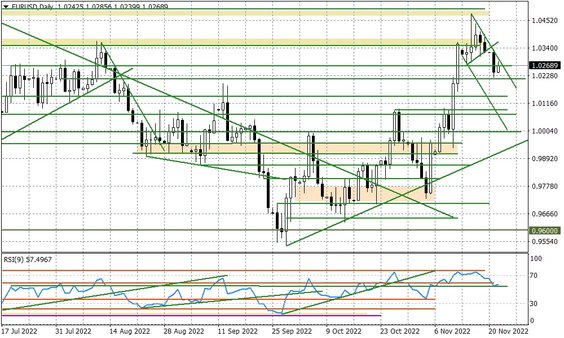 W tym kontekście wpływ mogły mieć wypowiedzi dwóch przedstawicielek FED, cytowanych dzisiaj rano przez agencje informacyjne. Loretta Mester (uchodząca za "jastrzębia"), oraz Mary Daly zgodnie przyznały, że FED może zmniejszyć agresywne tempo podwyżek stóp procentowych, co potwierdza rynkowe oczekiwania dotyczące 50 punktowej podwyżki w grudniu. Zdaniem Mester nie można jednak mówić o tym, że FED jest bliski zatrzymania cyklu podwyżek, a w opinii Daly nie można zupełnie wykluczyć, że stopy wzrosną powyżej 5 proc., gdyby inflacja nie chciała wyhamować. Niemniej Daly uważa, że rynek już odbiera obecny poziom stóp (3,75-4,00 proc.), jako bardziej restrykcyjny, niż jest w rzeczywistości i w związku z tym bank centralny musi działać tak, aby nie przesadzić. Te słowa jednak tylko teoretycznie brzmią nieco bardziej "gołębio". Wydaje się, że rynek może rozczarować się tym, co pokażą jutrzejsze zapiski FED, notabene z posiedzenia sprzed blisko 3 tygodni. Tym samym nie można wykluczyć, że da to argumenty do dalszej zwyżki dolara.