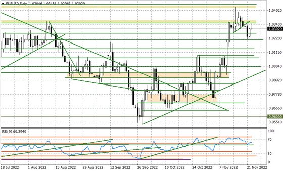 EURUSD wybił się jeszcze wczoraj ponad poziom 1,03 na fali słabości dolara na szerokim rynku w kontekście oczekiwań, co do "gołębiego" przekazu z minutek FED, które poznamy dzisiaj wieczorem. W nocy ruch był kontynuowany i zbliżyliśmy się w okolice oporu 1,0350-60. Nie został on przetestowany, a notowania powróciły w okolice 1,03 pomimo faktu publikacji szacunków indeksów PMI za listopad dla strefy euro, które okazały się być lepsze od oczekiwań. To może pokazywać, że słabość dolara na szerokim rynku może być krótkotrwała, a inwestorzy zaczynają być mniej pewni tego, co przyniosą wspomniane już zapiski FED.