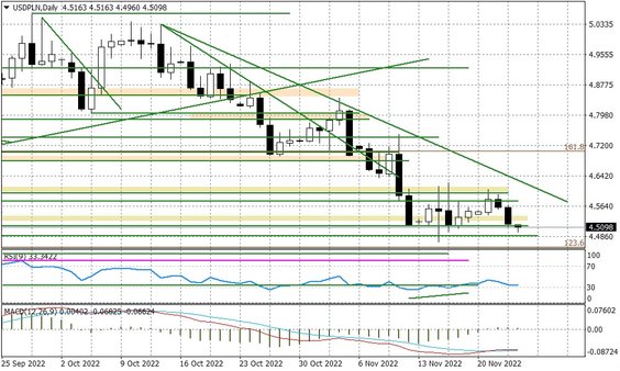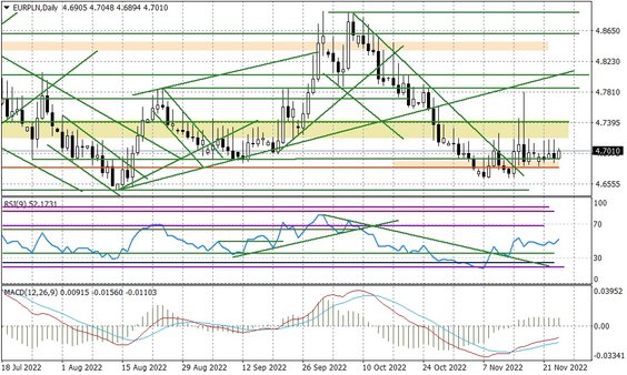 USA weszły już w przedłużony weekend (dzisiaj Święto Dziękczynienia), ale wpływ na notowania EURUSD mogą jeszcze mieć publikowane dzisiaj zapiski z ostatniego posiedzenia Europejskiego Banku Centralnego. Posiedzenie ECB w grudniu wypada dzień po FED (15 grudnia) i rynek zakłada kolejną podwyżkę o 50 punktów bazowych. Na szerszej perspektywie warto będzie zwracać uwagę na sytuację w Chinach - rosnąca liczba przypadków COVID może wymusić na tamtejszych władzach przywrócenie lockdownów w szerszej skali - co może nieco popsuć nastroje na rynkach, które teraz są dobre.