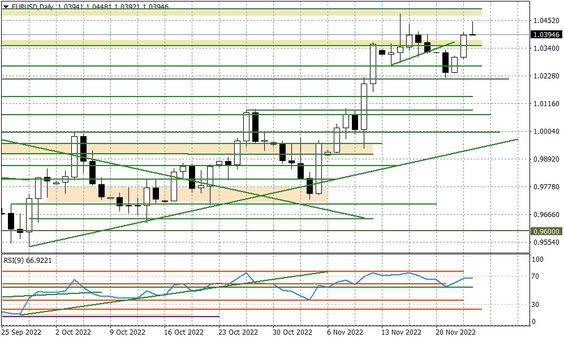 Notowania EURUSD cofnęły się w okolice 1,04 po tym jak dzienne maksimum wypadło w okolicach 1,0448. Brak inwestorów z USA może podbijać chęć do realizacji zysków już na sesji europejskiej. Dolar jest słabszy po ostatnich informacjach (PMI i zapiski FED), ale warto mieć na uwadze fakt, że wpływ na sentyment do końca tygodnia mogą mieć też pandemiczne doniesienia z Chin. Dzisiaj w kalendarzu mamy jeszcze publikację zapisków z ostatniego posiedzenia Europejskiego Banku Centralnego (godz. 13:30), ale nie wydaje się, aby miały one znaczenie w kontekście oczekiwań wobec tego, co zobaczymy na posiedzeniu 15 grudnia (podwyżka o 50 p.b. wydaje się być sensownym konsensusem). Opublikowane o godz. 10:00 dane Ifo z Niemiec za listopad wypadły lepiej potwierdzając wcześniejsze sygnały z indeksów PMI.