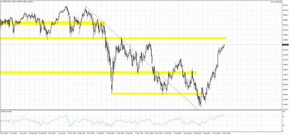 Wzrosty wspierane są przez kolejne komentarze płynące z Fed o zbliżającym się spowolnieniu tempa podwyżek. To główny argument dla byczo nastawionych inwestorów. Negatywnie oddziałuje on także na dolara i wspiera kurs złota. Jedna uncja wychodzi powyżej 1760 USD, a para EURUSD pozostaje powyżej 1.04. Notowania USDJPY testują wsparcie powyżej 138 po 3 dniach spadków. Dziś opublikowane były dane o inflacji bazowej w rejonie Tokio, które okazały się powyżej oczekiwań. Inflacja wzrosła do 3.6% r/r z 3.4% r/r w październiku, co jest najwyższym odczytem od czterech dekad.
