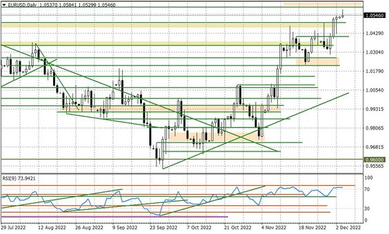 Rynek chyba woli to jednak zweryfikować przy okazji publikacji komunikatu i nowych projekcji makro ze strony FED, co będzie mieć miejsce 14 grudnia. Wcześniej poznamy jednak wiele istotnych danych: ISM dla usług (dzisiaj), inflację PPI (piątek), inflację CPI (wtorek przed FED), chociaż trudno ocenić, na ile mogłyby one zmienić trend na dolarze. W piątek po danych z rynku pracy powróciły oczekiwania, co do sufitu dla stóp procentowych w maju 2023 r. na poziomie 5,00-5,25 proc., ale dzisiaj rano były one już słabsze. Niezależnie od faktu, że zdaniem wpływowego dziennikarza Wall Street Journal (Timiraos) istnieje ryzyko, że FED podniesie stopy procentowe w 2023 r. ponad poziom 5 proc.