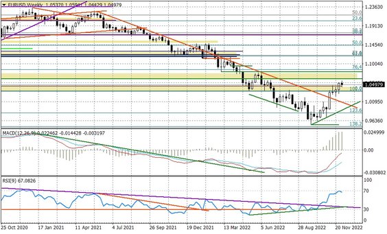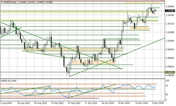 Wczoraj po południu EURUSD podbił w górę, ale nie zdołał wyjść ponad opór przy 1,0540. Późniejszy powrót poniżej 1,05 to sygnał, że oddala się perspektywa testowania ostatniego szczytu przy 1,0594, czy też ataku na ważny długoterminowo rejon 1,0634 (minimum z marca 2020 r.). Notowania zaczynają kreślić formację mogącą zapowiadać korektę całego ruchu od okolic 0,95 do 1,06. To oznaczałoby nawet powrót w rejon parytetu, czego nie wyklucza układ tygodniowy EURUSD.