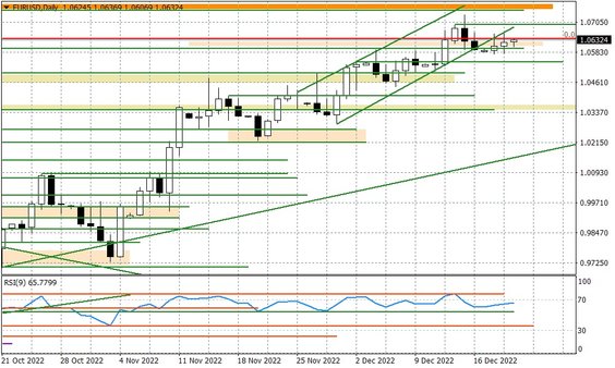 Wprawdzie EURUSD nie zdołał wyraźniej wybić oporu powyżej 1,0650, to jednak nie widzimy też chęci do mocniejszego zejścia poniżej 1,0600. Pasmo wahań się zawęża, co może być charakterystyczne dla okresu przedświątecznego, kiedy aktywność inwestorów na rynku maleje.