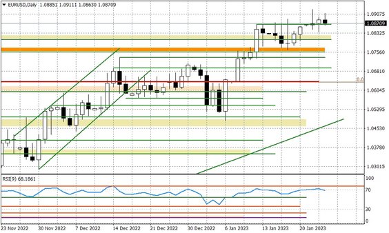 Mamy kolejne wybicie ponad 1,09 i kontrę podaży. Odczyt indeksu Ifo z Niemiec nie okazał się być wsparciem, a rynek zaczyna być zmęczony dyskusją o "jastrzębim" nastawieniu Europejskiego Banku Centralnego. Zresztą weryfikacja tego poglądu przyjdzie już w przyszłym tygodniu, kiedy to okaże się na ile ECB jest skłonny zapowiedzieć kolejną podwyżkę o 50 punktów baz. w marcu.