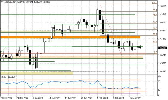 Brak inwestorów z USA generuje dzisiaj marazm. Rynek nastawia się na jutrzejsze dane PMI, oraz środowe zapiski FED. Raczej nie powinny one dać argumentów za 50 punktową podwyżką stóp przez FED w marcu, które to spekulacje pojawiły się w piątek rano. Tym samym może pojawić się przestrzeń do osłabienia dolara. Na to zresztą wskazuje przebieg notowań EURUSD z piątku, gdzie mamy białą świecę doji. Ważne opory na najbliższe dni to rejon 1,0735-65. Poziom 1,0765 był dwa razy naruszany w zeszłym tygodniu, ale nie było to trwałe.
