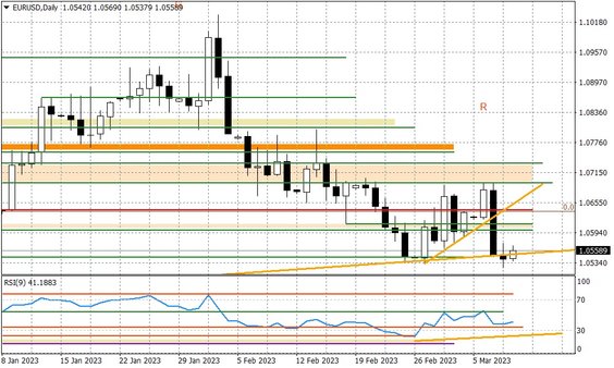 W czwartek raczej nie zobaczymy rozstrzygnięcia. Zmienność dadzą dopiero piątkowe odczyty Departamentu Pracy USA. Niemniej trzeba zwrócić uwagę na to, że wczoraj udało się powrócić ponad poziom 1,0532 (dołek z 27 lutego) i został on utrzymany. Rynek nie ma jednak iść w stronę 1,06 - wczorajszy szczyt, który nie został dzisiaj pobity to 1,0573. Rynki teraz kalkulują - teoretycznie zarówno ECB, jak i FED mogą podnieść w tym miesiącu stopy o 50 punktów baz. A co dalej? Czy ECB po marcowym posiedzeniu nadal pozostanie tak "jastrzębi" w deklaracjach i nie zrobi się nieco bardziej ostrożny, chociaż projekcje nadal wskazują na szczyt przy 4,00 proc.? W przypadku FED nawet, gdyby rzeczywiście doszło do ruchu o 50 punktów baz., co nie jest takie pewne, to szanse na powtórzenie tego w maju są znikome. Oczekiwana przez rynki skala podwyżek stóp w tym roku to 100 punktów baz. dla FED, przy 150 punktów baz. dla ECB.