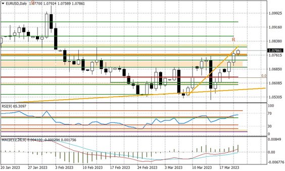 Koncepcja kilkumiesięcznej formacji głowy i ramion na wykresie EURUSD nadal pozostaje aktualna, chociaż wraz ze zwyżkami jej szanse będą maleć. Istotny poziom to strefa oporu przy 1,0800-1,0820, której wyraźne wybicie może skomplikować sytuację. Euro wspierają komentarze członków ECB ucinających spekulacje o rychłym pivocie na stopach procentowych i zapewniających, że sytuacja w europejskich bankach nie wymaga poważniejszej interwencji. Z kolei dolar czeka na dzisiejszy przekaz z FED - kluczowe jak zostanie zinterpretowany. Teoretycznie Rezerwa nie ma powodu, aby już teraz nakręcać oczekiwania na obniżki stóp procentowych, lepszym terminem do takiej dyskusji może być posiedzenie w czerwcu, kiedy to zaprezentowane zostaną kolejne prognozy makro.