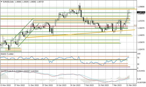Rano notowania EURUSD wyszły na nowe maksimum w ruchu rozpoczętym zaledwie tydzień temu - szczyt wypadł przy 1,0929, który to poziom zbiega się ze szczytami ze stycznia b.r. Wyżej mamy już tylko maksimum z lutego b.r. przy 1,1032. Później jednak szybko cofnęliśmy się poniżej 1,09. Skąd ten ruch? W reakcji na wczorajszy FED brakowało spójności - dolar potaniał, ale giełdy nie poszły w górę. Jako argument podawano tu fakt, że Powell nie zakończył jednoznacznie cyklu podwyżek i jednocześnie zaprzeczył temu, co rynki uparcie wyceniają, czyli możliwym obniżkom stóp już od najbliższych wakacji. To pokazuje jak trudna jest ostatnio interpretacja wydarzeń.