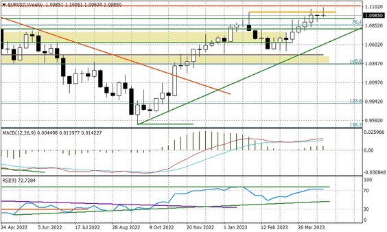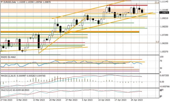 Wróćmy jednak do bieżących wydarzeń. Bohaterem dnia jest jen, który mocno stracił po decyzji Banku Japonii. Rynek spodziewał się "gołębiego" komunikatu, ale dzisiejszy przekaz wydaje się rozwiewać szanse na jakiekolwiek zmiany w tym roku. Sugerują to prognozy inflacji na lata 2024-25, ale przede wszystkim stwierdzenie, że zlecony przez BOJ tak zwany przegląd polityki monetarnej może potrwać nawet 1-1,5 roku. Na niekorzyść jena przemawia też widoczny wczoraj optymizm na rynkach akcji. Drugi temat to euro i spływające dane o inflacji i PKB w strefie euro. Jesteśmy już po odczytach z Francji (CPI i HICP w kwietniu powyżej prognozy) i Hiszpanii (odwrotnie, ale dane są wyższe niż w marcu). Przed nami jeszcze szacunki inflacji z Niemiec (godz. 14:00) i zbiorczy odczyt dla całej strefy euro we wtorek. Dane są na razie mieszane, w efekcie EURUSD się lekko cofnął i zszedł poniżej poziomu 1,10. Warto zwrócić uwagę, że dzisiaj poznajemy też dane o wzroście PKB w strefie euro za I kwartał, choć te również wypadły mieszanie (uwagę zwraca rozczarowanie z niemieckiej gospodarki).