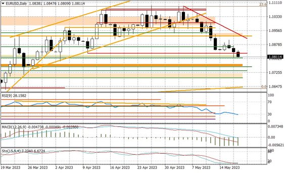 Dzisiaj uwagę zwraca słabość dolara australijskiego, który jest drugi w rankingu outsiderów poza norweską koroną. Powód to słabe dane z tamtejszego rynku pracy, które potwierdzają, że RBA zakończył już przygodę z podwyżkami stóp i nie zaskoczy znów, tak jak ostatnio. Nadal silny pozostaje z kolei dolar nowozelandzki, który czeka na przyszłotygodniowe wieści z posiedzenia RBNZ. Uwagę zwraca wyhamowanie przeceny jena, którego być może warto będzie uważniej monitorować w kontekście potencjalnych wahań na rynkach akcji. W przypadku EURUSD zaczynamy się stabilizować powyżej bariery 1,08.