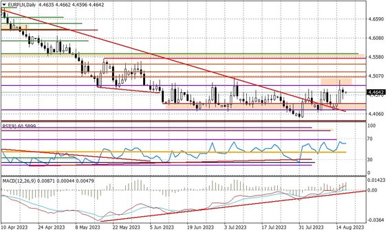W takim otoczeniu złoty radzi sobie słabo, ale nie tak źle, jakby mógł. Opublikowane wczoraj dane GUS o wzroście gospodarczym w II kwartale wypadły fatalnie (-3,7 proc. k/k), a rynek spodziewa się obniżki stóp procentowych przez RPP we wrześniu, co może zmniejszyć atrakcyjność wokół polskich aktywów. Spadek EURUSD poniżej bariery 1,09 wypchnął USDPLN powyżej bariery 4,10. Rynek nie powrócił jednak w okolice 4,12 obserwowane w świąteczny wtorek. Analogicznie EURPLN - dzisiaj rano mamy okolice 4,4650 w porównaniu z maksimum przy 4,4950 dwa dni temu.