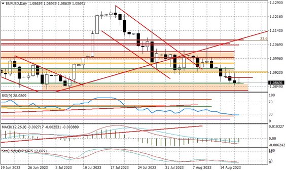 Wspomniany poziom to okolice ważnego wsparcia z 6 lipca (1,0833). Trend spadkowy na EURUSD pozostaje istotny, chociaż sam w sobie nie jest silny (często przeplatany korektami). W średnim terminie problemy Chin będą uderzać w europejską gospodarkę i przekładać się negatywnie na euro. W krótkim terminie wpływ na EURUSD będą mieć oczekiwania, co do polityki ECB na jesieni (podwyżek już definitywnie nie będzie), oraz tego, co zobaczymy w przyszłym tygodniu w Jackson Hole - jeżeli zaczną się pojawiać spekulacje, że Jerome Powell wybrzmi bardziej "gołębio", to zaważy to na dolarze (osłabi go) i wesprze ryzykowne aktywa, które ostatnio zostały mocno przecenione.