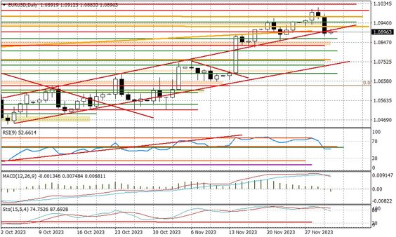 Z kolei regionalny Chicago PMI mocno zaskoczył odbiciem do 55,8 pkt. w listopadzie z 44 pkt. w październiku, co może rodzić spekulacje, że dzisiejsze dane ISM dla przemysłu będą mocne (odczyt poznamy o godz. 16:00 i spodziewane jest odbicie do 47,6 pkt.). W sytuacji, kiedy amerykańska gospodarka pozostanie relatywnie silna, może być trudno o realizację tak radykalnego scenariusza luzowania przez FED o którym myśli rynek (nawet, gdyby inflacja obniżała się zgodnie ze scenariuszem). Jednocześnie wypowiedzi decydentów z FED zdają się sugerować sceptycyzm wobec rynkowych scenariuszy - Mary Daly i John Williams (i tu jest zaskoczenie po stronie wiceprezesa FED) nie wykluczyli, że stopy procentowe mogłyby jeszcze wzrosnąć. To dało argument do odbicia rentowności amerykańskich obligacji od swoich minimów, lekkiego cofnięcia indeksów na Wall Street i umocnienia dolara.