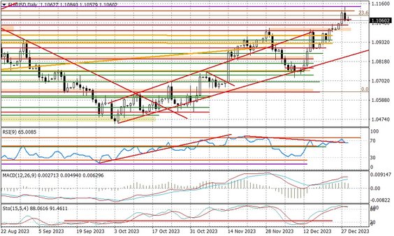 Dzisiaj w gronie najsilniejszych walut jest frank, dalej mamy dolara nowozelandzkiego, funta i dolara australijskiego. Siła szwajcarskiej waluty może nie być tu przypadkowa. Nominalnie oczekiwania, co do skali cięć stóp przez SNB w 2024 r. wypadają blado przy innych bankach centralnych, a USDCHF jest na tegorocznych minimach. Jednocześnie wskaźnik nastrojów KOF za grudzień nieoczekiwanie wzrósł do 97,8 pkt. przy oczekiwaniach na poziomie 97,0 pkt.