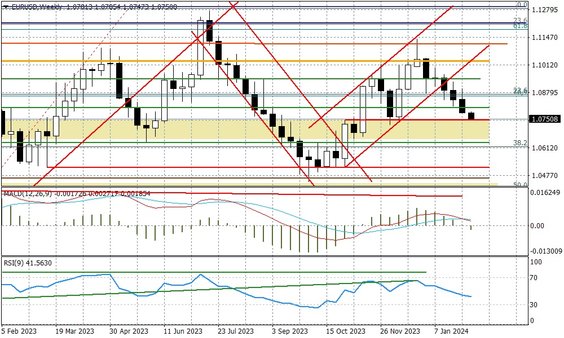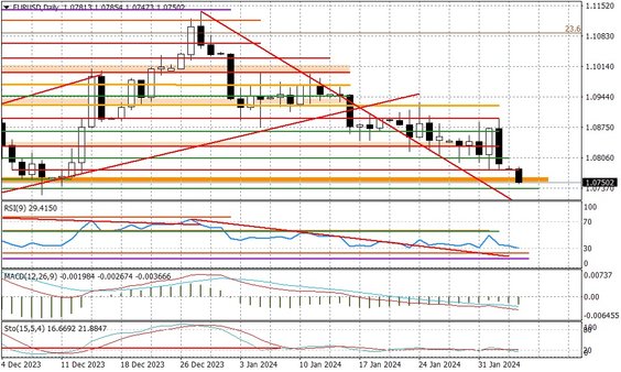 Para EURUSD osuwa się w dół, gdyż o ile rynki redukują już swoje oczekiwania, co do cięcia stóp w maju (marzec został już definitywnie skreślony), o tyle w przypadku ECB nadal mamy ponad 50 proc. szans na to, że do poluzowania polityki dojdzie już w kwietniu. To oczywiście również się zmieni i najpewniej zostanie to wykorzystane jako argument do odbicia euro. Tak jednak na razie nie jest i EURUSD dotarł do kluczowego wsparcia przy 1,0750. Ten poziom ma znaczenie zwłaszcza w średnim terminie, co widać na wykresach poniżej.