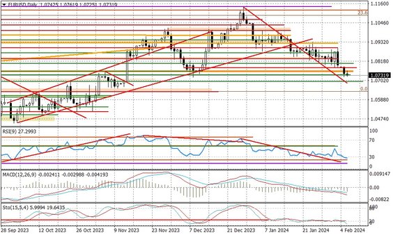 Para EURUSD naruszyła wczoraj rejon wsparć 1,0730-50, ale nieznacznie. Dzisiaj odbiliśmy w okolice 1,0760 po nieoczekiwanie dobrych danych o zamówieniach w niemieckim przemyśle (czy to "jaskółka" zwiastująca zmianę?), ale nie na długo. Para EURUSD szuka dna, ale jeżeli nie zejdzie poniżej 1,07 dzisiaj, lub jutro, to spróbujemy wracać do 1,0780-1,0795, gdzie mamy w krótkim terminie ważny opór. Warto będzie obserwować wieczorne zamknięcie się giełdy na Wall Street - korzystny sentyment może dać impuls do odbicia EURUSD. Kluczowe dla FX dane to inflacja CPI w USA za styczeń, która spłynie dopiero 13 lutego. I tego dnia możemy być świadkami ogromnej zmienności.