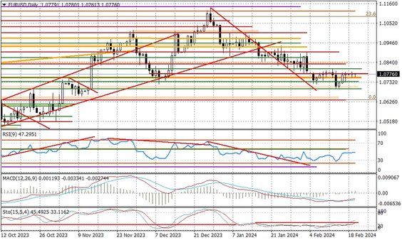 Generalnie dolar jednak dzisiaj minimalnie odbija na szerokim rynku. Zmiany są kosmetyczne i być może taki obraz nie ma większego znaczenia, gdyż rynek tak naprawdę dopiero teraz wraca do handlu po weekendzie - wczoraj mieliśmy President's Day w USA. Dzisiaj w kalendarzu uwagę zwrócą dane o inflacji CPI w Kanadzie o godz. 14:30 (rynek widzi pierwszą obniżkę stóp przez BOC najwcześniej w czerwcu - 51 proc. prawdopodobieństwa). Później o godz. 16:00 mamy wskaźniki wyprzedzające LEI w USA, a późnym wieczorem dane o inflacji PPI w Nowej Zelandii. Kluczowym punktem mogą być jednak dopiero publikowane w środę wieczorem zapiski z posiedzenia FED.