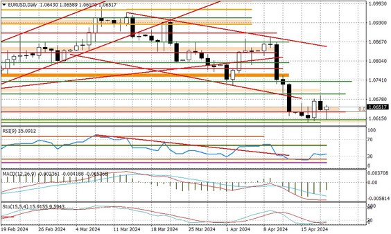 Wsparcie w okolicach 1,06 zostało dzisiaj utrzymane, a szybki powrót do 1,0650 sugeruje, że mamy szanse wybić wczorajszy szczyt przy 1,0689. Ze strony przedstawicieli FED padają kolejne "jastrzębie" komentarze, ale dolar przestaje się nimi przejmować. Analogicznie - po drugiej strony mamy "gołębią" narrację ze strony członków Europejskiego Banku Centralnego (obniżka stóp już w czerwcu). Jeżeli uda się wybić 1,0689, to naruszymy też rejon 1,0694 i ważnym oporem staną się okolice 1,0722. Jeżeli nie pojawią się jakieś nowe tematy geopolityczne w weekend, to rynki będą chciały mocniej odreagować ostatnią przecenę.