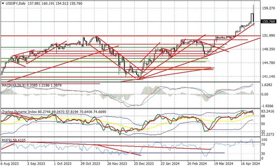 Teoretycznie znaczenie dawnych minimów i maksimów na wykresie jest nieco ograniczone czasowo - tym samym poziomy sprzed 34 lat nie powinny mieć większego znaczenia. Niemniej dzisiaj USDJPY zbliżył się do 160,35 - poziomu z lutego 1990 r. - po czym zawrócił poniżej 160,00. Silny ruch w okolice 155,00 miał znamiona interwencji, która nastąpiła po wyraźnym osłabieniu się jena w piątek.