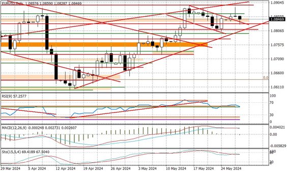 Para EURUSD wytraca momentum wzrostowe - wczorajsza świeca podkreśla znaczenie oporu wokół 1,0890. Gorszy sentyment na rynkach akcji może prowokować do dalszego podbicia dolara na szerokim rynku i cofnięcia się EURUSD. Przyszłotygodniowa obniżka stóp przez ECB jest w kursie euro, a rynek idzie w stronę wyceny, że poza cięciem w czerwcu, będzie tylko jeszcze jeden ruch w tym roku (na jesieni), co teoretycznie nie daje argumentu za mocniejszym cofnięciem się euro. Niewykluczone, że w sytuacji pogorszenia się sentymentu na Wall Street, para EURUSD będzie bardziej dążyła w stronę konsolidacji ze wsparciem przy 1,08, dlatego też korekta spadkowa nie będzie szczególnie głęboka.