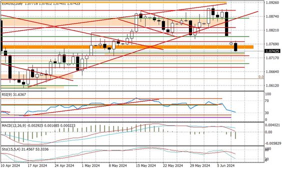 Para EURUSD po mocnym spadku w piątek, nowy tydzień rozpoczęła od luki spadkowej. I zniżka trwa nadal. To odpowiedź rynku na doniesienia z Francji i generalnie mało ciekawe perspektywy dla Unii Europejskiej za pięć lat - bo skrajna prawica sukcesywnie wzmacnia swoją pozycję przy każdych kolejnych wyborach. Niemniej to informacje z Paryża wstrząsnęły rynkami - wybory do parlamentu już w końcu czerwca to sygnał, że władzę najpewniej przejmie prawicowe Zjednoczenie Narodowe, co dla rynków oznacza sporą niepewność. Kiepskie doniesienia nadeszły także z Berlina, gdzie prawicowa AfD wyprzedziła rządzącą SPD, co zapowiada schyłek epoki kanclerza Olafa Scholza. Wybory w Niemczech odbędą się jednak planowo, czyli za rok. Ale czy na pewno?