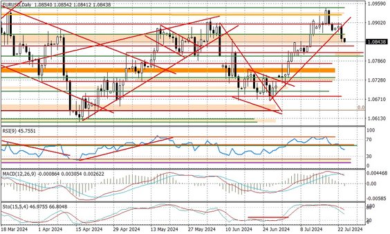 W średnim terminie kluczowy układ wsparć na EURUSD to zaznaczona na wykresie poniżej strefa 1,0800-1,0810. Dopiero jej złamanie sugerowałoby, że EURUSD może zrealizować znacznie głębszą korektę. W przeciwnym razie obrona 1,08, jeżeli będzie skuteczna, może skutkować próbą powrotu w rejon szczytu z połowy lipca w rejonie 1,0950. W średnim terminie ważnym punktem kalendarza powinno być posiedzenie FED 31 lipca, które powinno "nastawić" rynek na początek obniżek stóp procentowych od września.