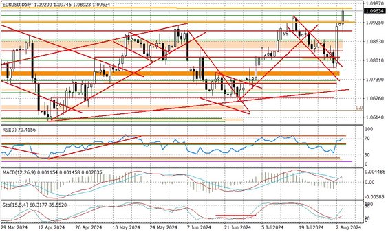 Para EURUSD wybiła dzisiaj rano okolice szczytu z połowy lipca przy 1,0950. Dramatycznie szybko rosną oczekiwania rynków, co do skali cięć stóp przez FED - wycena ruchu we wrześniu to obecnie -49 punktów baz., a do końca roku oczekuje się luzowania aż o 125 punktów baz. To stawia Rezerwę Federalną w gronie największych "gołębi" i nie pozostaje bez wpływu na wycenę dolara.