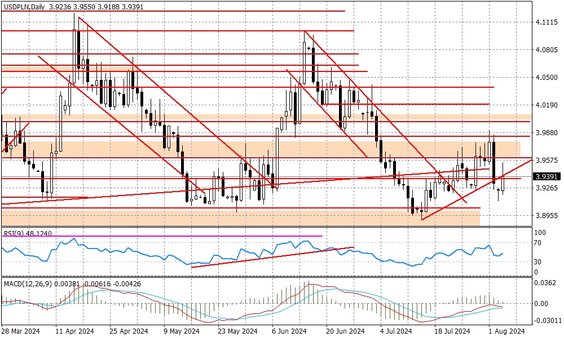 Prym wiedzie Japonia, gdzie tamtejszy indeks Nikkei stracił ponad 10 proc., a jen zaliczył kolejne, wyraźne umocnienie - tym razem USDJPY spadł o ponad 2 proc. Rynkami rządzą emocje, a inwestorzy spoglądają na banki centralne - rynek daje już 90 proc. szans scenariuszowi "awaryjnej", bo aż 50 punktowej obniżki stóp przez FED we wrześniu. Do końca roku stopy procentowe mają spaść aż o 125 punktów baz. Tak agresywna wycena przekłada się na wyraźny spadek rentowności amerykańskich obligacji - 10-letnie naruszyły dołek z grudnia ub.r. Ucieczka inwestorów od ryzyka doprowadziła do załamania się rynku kryptowalut - futures na BTC spadł w pewnym momencie poniżej 50 tys. USD.