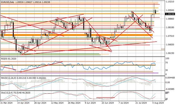 Dzisiaj rano w centrum uwagi znalazł się australijski RBA, który nie zmienił stóp procentowych. Decydenci nie wystraszyli się ostatniego zamieszania na rynkach i w zasadzie podtrzymali ostatni, względnie "jastrzębi" komunikat. Wskazuje on na konieczność dalszego monitorowania czynników inflacyjnych i zostawia wszystkie opcje na stole (łącznie z podwyżką stóp na kolejnych posiedzeniach). Realnie jednak szanse na taki ruch nie są wielkie. Rynek i tak bardziej skłania się do obniżki stóp i to wcześniejszej - ostatnio zaczął być wyceniany grudzień 2024 r., podczas kiedy do tej pory mowa była o połowie 2025 r. Dolar australijski zareagował na te doniesienia z RBA lekkim odbiciem. Jednak dzisiaj silniejsze są korony skandynawskie. Grupa walut zachowujących się lepiej od dolara jest jednak niewielka, amerykańska waluta radzi sobie nieźle. Najsłabiej wypada wspomniany na początku japoński jen. Na EURUSD mamy powrót poniżej 1,0950 po tym, jak wczoraj mieliśmy nieudaną próbę wybicia 1,10. Euro nie pomogły lepsze dane z Niemiec, jakie zostały opublikowane rano. Zamówienia w tamtejszym przemyśle odbiły w czerwcu o 3,9 proc. m/m.